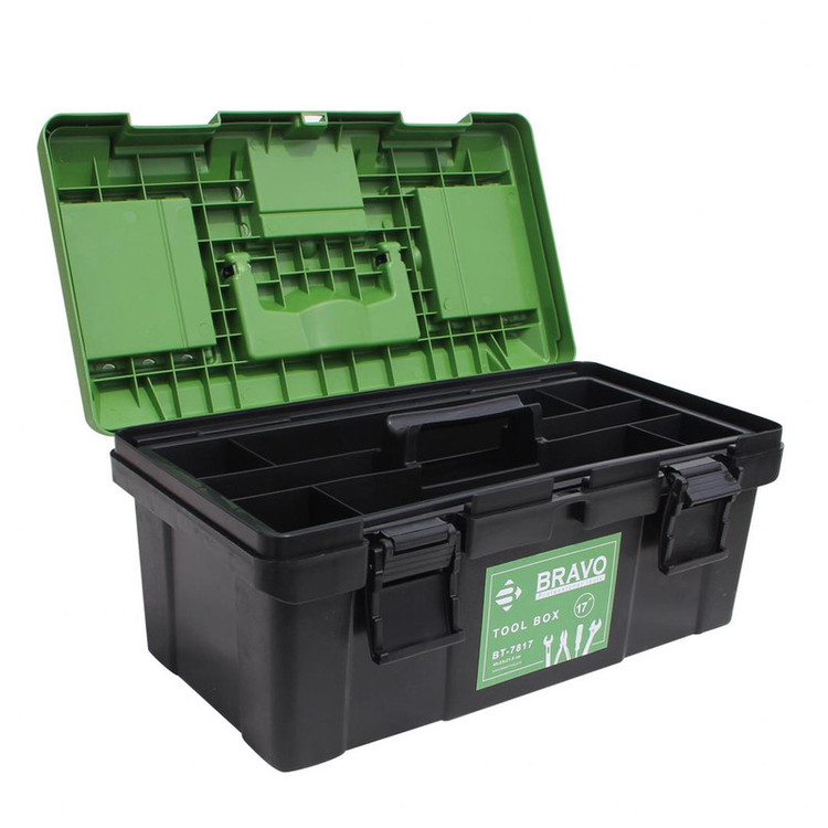 جعبه ابزار پلاستیکی براوو مدل BT-7817 که سایز آن 17 اینچ می باشد. ابعاد جعبه به طول 45 ، عرض 23 و ارتفاع 22 سانتی متر می باشد. این محصول مقاوم در برابر ضربه بوده و تولید شده از بهترین مواد اولیه می باشد. همچنین دارای قفل های پلاستیکی مقاوم و نشکن و نیز ساختار مناسب با بیشترین ظرفیت فضای داخلی می باشد. دارای سه محفظه روی درب جعبه و طبقه جدا کننده داخل جعبه می باشد.