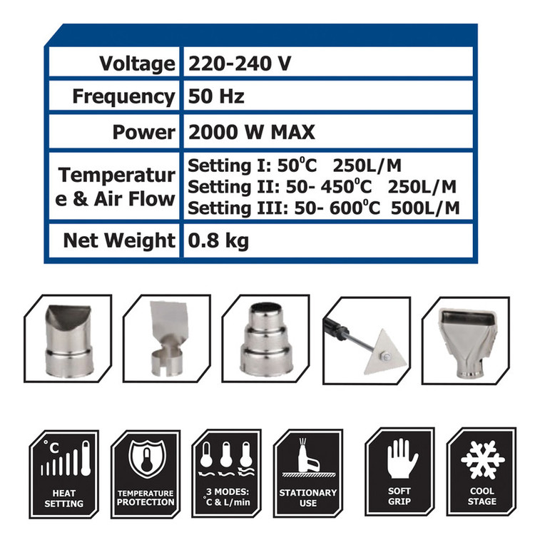 سشوار صنعتی مدل KHG-5620 یک دستگاه دمنده است. این محصول که با برندی کنزاکس عرضه میشود، موتور قدرتمندی دارد. در این دستگاه قابلیت تنظیم فشار دمش باد و میزان حرارت وجود دارد. شکل ظاهری و وزن مناسب محصول، استفاده از این دستگاه را آسانتر کرده است. مدل KHG-5620 یک از سشوارهای صنعتی تولیدشده توسط شرکت «کنزاکس» (KENZAX) است. این دستگاه قابلیت دمش هوای گرم و معمولی را دارد. یک موتور 2000 واتی عمل دمش را انجام میدهد و یک المنت که بین مسیر دمش قرارگرفته، باعث گرم شدن باد خروجی میشود. یک کلید سه حالته، روی دستهی محصول قرار دارد. با استفاده از این کلید نوع باد خروجی (گرم یا معمولی) و میزان فشار باد خروجی مشخص میشود. در حالت اول باد معمولی با فشار 250 لیتربردقیقه از نازل دستگاه خارج میشود. حالت دوم مشابه حالت اول است ولی باد خروجی گرم میدمد. در حالت سوم هم باد گرم با فشار 500 لیتربردقیقه در اختیار کاربر قرار میگیرد. یک کلید گردان در بالای دستهی محصول قرار دارد که به کمک آن میتوانید دمای هوای خروجی از دستگاه را بین 50 تا 600 درجهی سانتیگراد تنظیم کنید. البته تغییرات دما، در صورتی است که کلید سه حالته، روی حالت 2 یا 3 باشد. شکل تفنگی دستگاه در کنار وزن 800 گرمی محصول، باعث میشوند تا کاربر بهراحتی از سشوار صنعتی مدل KHG-5620 استفاده کند. از سشوارهای صنعتی در شغلهای مختلفی مانند صنایع بستهبندی استفاده میشود. در صنایع برق و برای جمع شدن وارنیشهای حرارتی هم از سشوارهای صنعتی استفاده میکنند. کنزاکس سشوار مدل KHG-5620 را برای استفاده در صنایع مختلف تولید کرده است. این سشوار دارای توان 2000 وات است. در این محصول قابلیت تنظیم درجهی حرارت و فشار باد وجود دارد. به همراه این محصول 5 نازل از جنس استیل جهت کاربری های متفاوت در اختیار شما قرار خواهد گرفت .