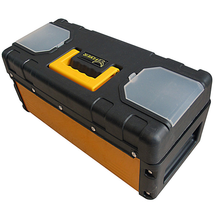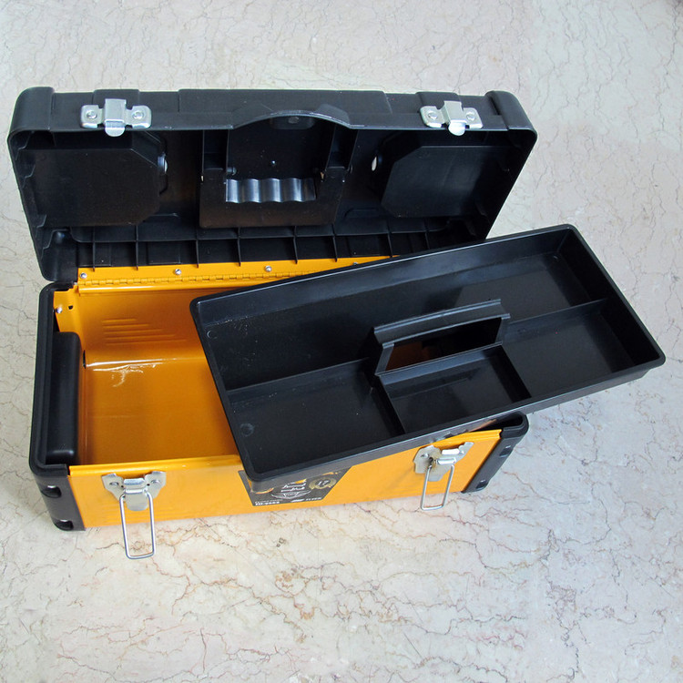 دسته جعبه ابزار قسمت مشکی رنگ بدنه از جنس پلاستيک می باشد قسمت رنگی بدنه و چفت و بست های درب فلزی می باشد.