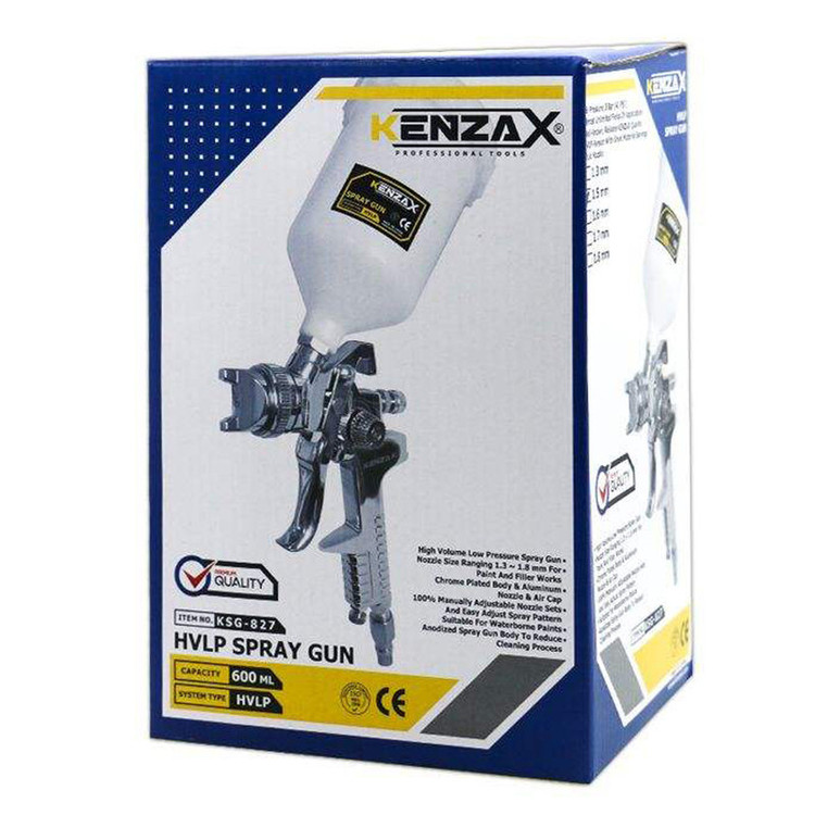 پیستولههای برقی یا بادی ازجملهی وسایلی هستند که از آنها برای نقاشی و رنگآمیزی سطوح مختلف استفاده میشود. استفاده از این ابزار سرعت عمل نقاش را بالا میبرد. البته در خصوص ییستولههای بادی باید در نظر داشت که به یک منبع یا کمپرسور باد احتیاج دارند. یکی از پیستولههای رنگ که توسط شرکت کنزاکس (KENZAX) تولید میشود، مدل KSG-827است. این محصول دارای تنوع در قطر نازل (5/7،1/1 و 1.8) میلیمتر بسته به کاربری میباشد . از جمله مزایای KSG-827 میتوان به کاسه (مخزن) رنگ پلاستیکی شفاف و مقاوم با ظرفیت 600 میلی لیتر اشاره نمود . همچنین بدنه ی آلومینیومی این محصول دارای روکشی از آلیاژ کروم نیکل میباشد که هنگام شستشو در تینر باعث عدم خوردگی آن میگردد. سوزن این محصول از جنس استیل ضد زنگ ، نازل از جنس برنج ساخته شده است. در ساخت این پیستوله کنراکس KSG-827 از تکنولوژی HVLP بهره برداری شده است که با کمترین میزان فشار بیشترین پاشش رنگ را امکان پذیر می نماید . سوزن استیل ضد زنگ که ستفاده شده که باعث عمر بیشتر این پیستوله میشود . همچنین مخزن این مدل 600 میلیلیتر رنگ را در خود جای میدهد. برای استفاده از این محصول باید یک پمپ یا کمپرسور باد داشته باشید. سپس پیستولهی رنگ را با شلنگهای مخصوص به کمپرسور متصل کنید. از مزایای KSG-827 کنزاکس میتوان به دنباله شلنگ خور آن اشاره نمود . مخزن این محصول را با رنگ پر کرده و رنگآمیزی را شروع کنید. به همراه این محصول، چند قطعه لوازم جانبی شامل آچار، فرچهی کوچک و فیلتر قرار دارد که به کمک آنها، میتوانید استفادهی بهتری از پیستوله کرده و آن را به راحتی تمیز کنید. از آچار برای باز کردن قطعات و از فرچهی کوچک برای تمیز کردن قطعات بازشده استفاده میشود. فیلتر کوچک هم برای قرار گرفتن در محل اتصال مخزن به پیستوله در نظر گرفتهشده و از ورود اجسام ریز به داخل پیستوله جلوگیری میکند. شما میتوانید برای سرعت دادن به روند رنگآمیزی، بهجای استفاده از قلمموی رنگ از پیستولهی بادی مانند پیستوله بادی کنزاکس مدل KSG-827استفاده کنید. جنس فلزی بدنه و نازل استیل در این محصول، باعث مقاومت و عمر بسیار بالای آن میشود. مخزن پلاستیکی این محصول حجم مناسبی از رنگ (600 سیسی) را در خود جای میدهد. پس از هر بار استفاده از پیستوله، باید به کمک وسایلی که به همراه این محص