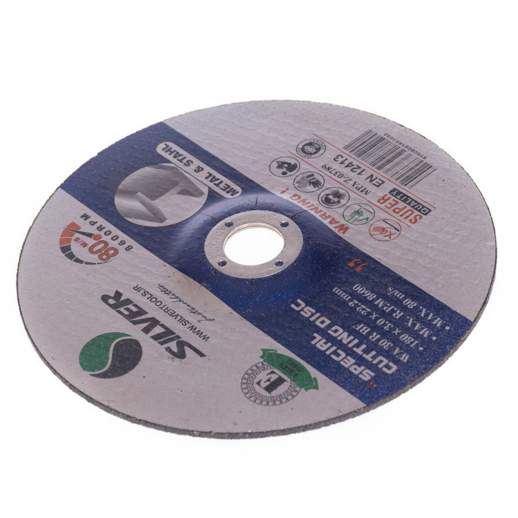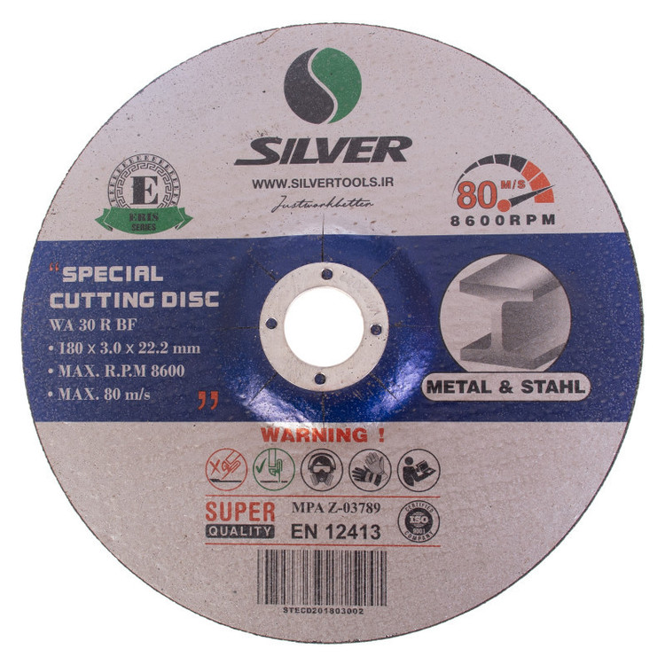 صفحه برش سیلور یک سنگ برش آهن با سایز 22.2 × 3 × 180 است که دارای مشخصه WA 30 R BF میباشد به این معنا که ساخته شده از اکسید آلومینیوم سفید (WA)، با اندازه دانهی متوسط (30)، با درجه سختی متوسط (R) و دارای پیوند رزینی تقویت شده (BF) است. ساختار فیبری این صفحه فرز دوام و استحکام آن را افزایش داده تا به خوبی برای برش انواع فولاد و آهن در انواع امور کارهای آهنگری، تاسیسات و صنایع عمومی و تخصصی مناسب باشد. این دیسک گزینهی بسیار خوبی برای کسانی است که به خرید صفحه برش آهن می اندیشند. قطر کلی این دیسک برابر با 180 میلیمتر یا 7 اینچ و قطر سوراخ داخلی یا قطر محور آن برابر با 22.2 میلیمتر است.حداکثر سرعت خطی این دیسک 80 متر بر ثانیه و سرعت چرخشی آن برابر با 8600 دور در دقیقه است و میتوانید آن را بر روی انواع فرز آهنگری نصب کنید و به برشکاری خود بپردازید. ضخامت این صفحهی بسیار با کیفیت و با دوام، برابر با 3 میلیمتر است و وزنی معادل با 175 گرم دارد. شرکت سیلور این دیسک برش آهن را بر اساس استاندارد EN 12413 در کشور چین تولید نموده است.