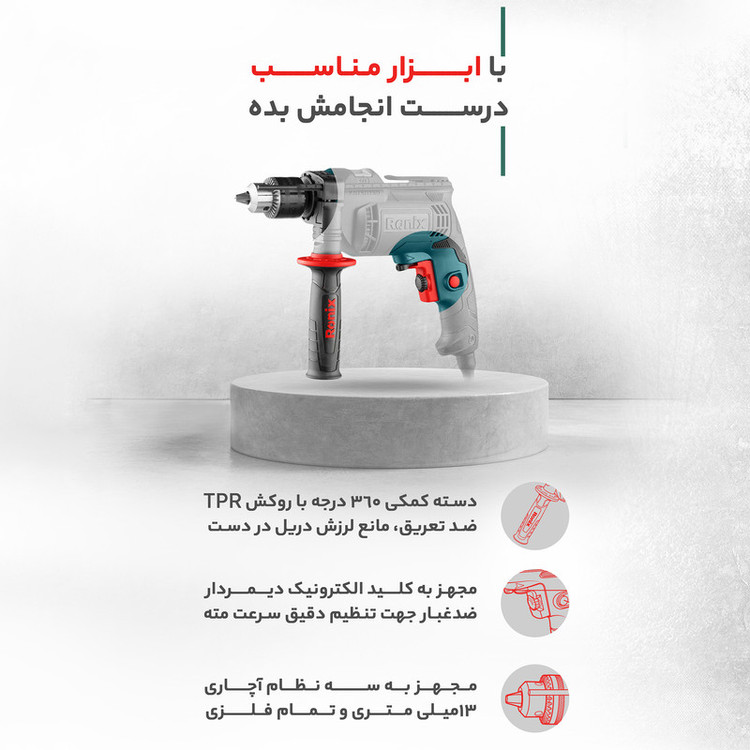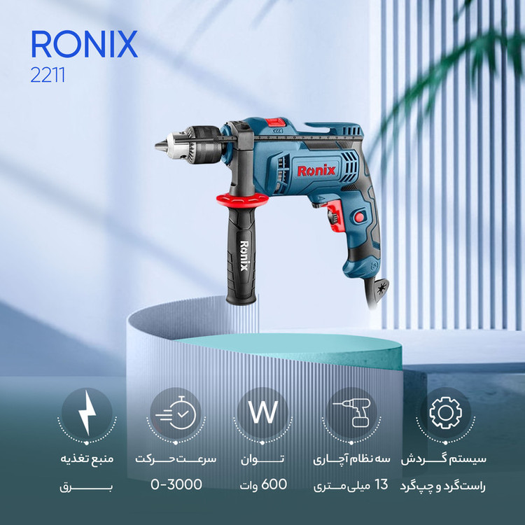 دریل چکشی رونیکس مدل 2211 از برند خوش نام رونیکس است . انواع دریلها را از نظر ساختار میتوان به دریلهای ستونی و قابل حمل تقسیم کرد. دریلهای تخریب هم در هر دو گونهی برقی و شارژی قابل تهیه هستند؛ پیستون واقعی درنظر گرفته شده برای این دریلها در مقایسه با دریلهای چکشی معمولی قدرت ضربه و تخریب بیشتری دارند. بارزترین تفاوت میان ابزار دریلهای تخریب و دریلهای چکشی هم توانایی ضربه زدن با نوک ابزار نوع پیستونی، آنهم بدون چرخش ابزار است؛ در حالی که در نوع معمولی یا چکشی چنین امکانی فراهم نیست. انواع دریلهای شارژی و برقی امروزی معمولا از باتریهای نیکل-کادمیوم یا لیتیومی استفاده میکنند. حتی انواع چکشی این دریلهای شارژی هم در ابعاد بسیار کوچک وجود دارند. دریل 2211 از شرکت رونیکس نیروی خود را از طریق برق شهری تامین میکند. بیشینه سرعت دوران این دریل 3000 دور بر دقیقه است. دلر رونیکس 2211 توانایی چرخش در دو جهت را دارد. با استفاده از دریل 2211 قادر خواهید بود سوراخهایی حداکثر با قطر 13 میلیمتر در فلز و 13 میلیمتر در سیمان و تا 30 میلی متر در چوب ایجاد کنید. دريل شارژي مدل 2211 با داشتن قابلیت چکشی و توان 600 وات دریلی مناسب برای مصارف خانگی و تجاری است. دریل چکشی رونیکس مدل newpw 2211 professional مجهز به دسته جانبی دورانی و نیز شاخص عمق سنج نیز است. با توجه به مشخصات دریل رونیکس 2211 این مته از قابلیت و کارایی بسیار بالایی برخوردار است.