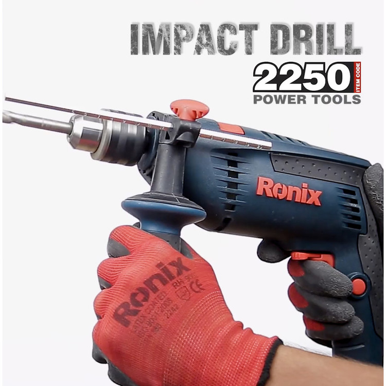 امروزه برای سوراخ کردن اجسام مختلف، از انواع دریلهای برقی یا شارژی استفاده میکنند. کار با این دستگاه کار چندان مشکلی نیست و نیاز به کسب مهارت خاصی ندارد. با توجه به میل افراد جامعه به انجام کارهای فنی در منزل، در بسیاری از خانهها نمونهای از این دستگاه دیده میشود. حتی بانوان هم میتوانند بهراحتی از این دستگاه استفاده کنند. دریلها انواع مختلفی دارند و انرژی موردنیاز خود را از برق یا باتری میگیرند. با استفاده از دریلهای معمولی قادر به سوراخ کردن اجسامی از جنس چوب، پلاستیک یا فلزات هستید. اما با دریلهای چکشی علاوه بر این موارد، دیوار، سرامیک و انواع مصالح ساختمانی را میتوانید سوراخ کنید. دریل چکشی رونیکس کد 2250 ابزاری مناسب برای سوراخکاری در انواع سطوح چوبی و فلزی است. حداکثر قطر سوراخکاری آن در چوب 20 میلیمتر و در فلز 13 میلیمتر و در مصالح نیز 13 میلیمتر است. این محصول از سیستم گردشی راستگرد و چپگرد بهره میبرد. این ابزار، امکان سوراخکاری در حالت معمولی و ضربهای را فراهم میسازد. منبع تغذیهی این دریل، برق شهری است و با ولتاژ ورودی 220 ولت کار میکند. توان خروجی این ابزار 850 وات است و میتواند با سرعت گردش تا 3000 دور در دقیقه به سوراخکاری بپردازد. برای سهولت در سوراخکاری، دستهای در قسمت جلویی دستگاه قرار دارد.