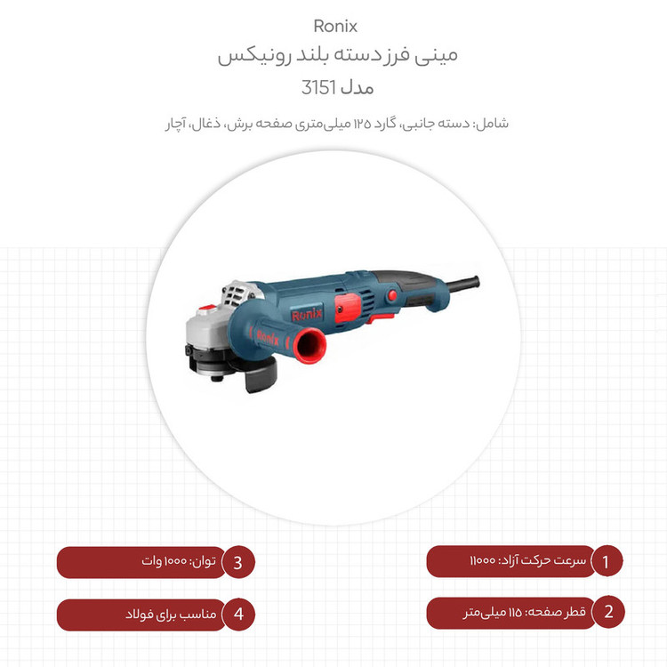 مینی فرز دسته بلند رونیکس مدل 3151 بدنهای متفاوتی نسبت به سایر مینیفرزهای موجود در بازار دارد. مدل 3151 یک مینیفرز 1000 واتی است.صفحهی فرز این دستگاه در حالت آزاد با سرعت 11000 دوربردقیقه میچرخد. برای استفاده از این محصول مانند بسیاری از مینیفرزها باید از صفحهی فرز با قطر 115 میلیمتر استفاده کنید. این مدل مجهز به سیستمی است که باعث میشود گریس بهصورت مداوم در میان چرخدندهها وجود داشته باشد؛ این موضوع کارایی و عمر دستگاه را افزایش میدهد. بدنهی مدل 3151 نسبت به بیشتر مینیفرزها متفاوت است. شکل بدنهی این محصول طول بلندی دارد و به کاربر در استفادهی راحتتر از دستگاه کمک میکند. دستهی کمکی پلاستیکی این دستگاه را میتوانید از سه جهت به دستگاه متصل کنید.