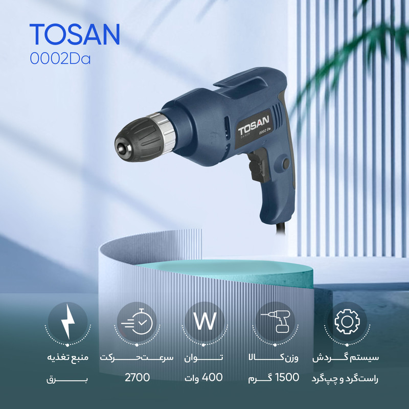 دریل ازجملهی ابزارهایی است که در صنعت و تجارت کاربرد فراوانی دارد. امروزه نیاز به دریل تا حدی افزایشیافته که در بسیاری از منازل هم یک مدل از این دستگاه وجود دارد. از دریلها برای سوراخ کردن اجسام مختلف استفاده میکنند. دریلها در انواع معمولی، چکشی و تخریبی با طرحها و ابعاد مختلفی ساختهشدهاند. شرکتهای مختلفی هم به تولید این دستگاه کارآمد مشغول هستند. شرکت «توسن» (Tosan) یکی از تولیدکنندگان داخلی ابزار است و گونههای مختلف دریل در میان محصولات این شرکت دیده میشود. کیفیت قابلقبول و قیمت مناسب محصولات این شرکت باعث شده تا در بازار کشورمان جایگاه مطلوب و مناسبی را برای عرضه و فروش ابزارآلات خود پیدا کند. دریل مدل 0002 Da یکی از محصولات توسن است که یک دریل معمولی با سهنظام خودکار محسوب میشود. این محصول شباهت بسیار زیادی به مدل 0002D دارد و تنها تفاوت این دو محصول شرکت توسن در نوع سهنظام آنها است. 0002Da دارای موتوری با قدرت 400 وات است. سرعت گردش این دریل در حالت آزاد به 2700 دوربردقیقه میرسد. طراحی ارگونومیک و حجم و وزن بسیار مناسب این دستگاه باعث شده تا از این دستگاه در مصارف خانگی هم بتوانید استفاده کنید. تنوع محصولات توسن درزمینهی ابزار بهخصوص در سالهای اخیر باعث رشد و ارتقاء جایگاه این شرکت در بین مشتریان ابزار در کشورمان شده است. این شرکت علاوه بر تولید محصولات و ابزار صنعتی، در خصوص تولید ابزارهایی که بتوان بهراحتی در منزل هم از آنها استفاده کرد هم فعالیت محسوسی داشته است. دریل مدل 0002 Da یکی از دریلها و محصولاتی است که با برند Tosan به بازار عرضهشده و استفاده از آن بهسرعت و با سهولت بالایی امکانپذیر است.