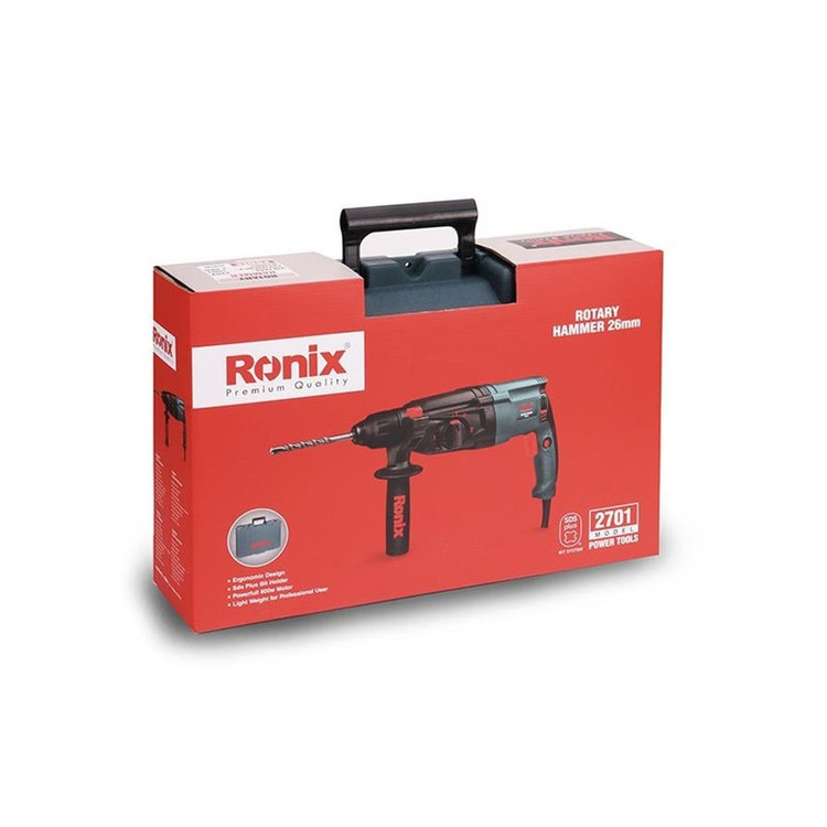 شرکت رونیکس Ronix با ارائه چندین مدل دریل بتن کن در کلاس ها و وزن های مختلف، انتخاب یک دریل بتن کن مناسب را برای مشتریان راحت تر کرده است. دستگاه پیش روی شما که جزو سبک ترین مدل های بتن کن و مناسب کارهای نصب در پروژه های ساختمانی میباشد مدل 2701 رونیکس است و با وزن 2.6 کیلوگرم و ابعاد 38 × 21 × 8 سانتیمتر، یک دریل بتن کن ضربهای با قدرت 800 وات است. سرعت این دریل در حالت بی باری تا 1100 دور بر دقیقه میرسد و دارای قابلیت کنترل سرعت است. این دستگاه هم برای مصارف خانگی و هم برای استفاده در کارگاههای ساختمانی و صنعتی بسیار مناسب است. این دریل توانایی سوراخکاری در چوب، فلز و بتون را دارد و حداکثر قطر سوراخ در این دستگاه در چوب، فلز و مصالح، به ترتیب 30، 13 و 26 میلیمتر است و برای تعویض مته نیازی به آچار ندارد و با ضامن موجود در گلویی دستگاه به سادگی انجام پذیر است. بتن کن 2701 از متریال درجه 1 و تحت استانداردهای روز اروپا توسط شرکت خوش نام رونیکس ساخته و به بازار ارائه گردیده است. از دیگر مزایای این دستگاه کلید چپ گرد راستگرد آن است که در انتهای دستگاه به گونه ای تعبیه گردیده که به سهولت از دو طرف دستگاه قابل تغییر است. .علاوه بر این، برخلاف مدلهای دیگر که کلید چپگرد راستگرد آنها روی شاسی دستگاه نصب شده است از مقاومت بالایی برخوردار است.