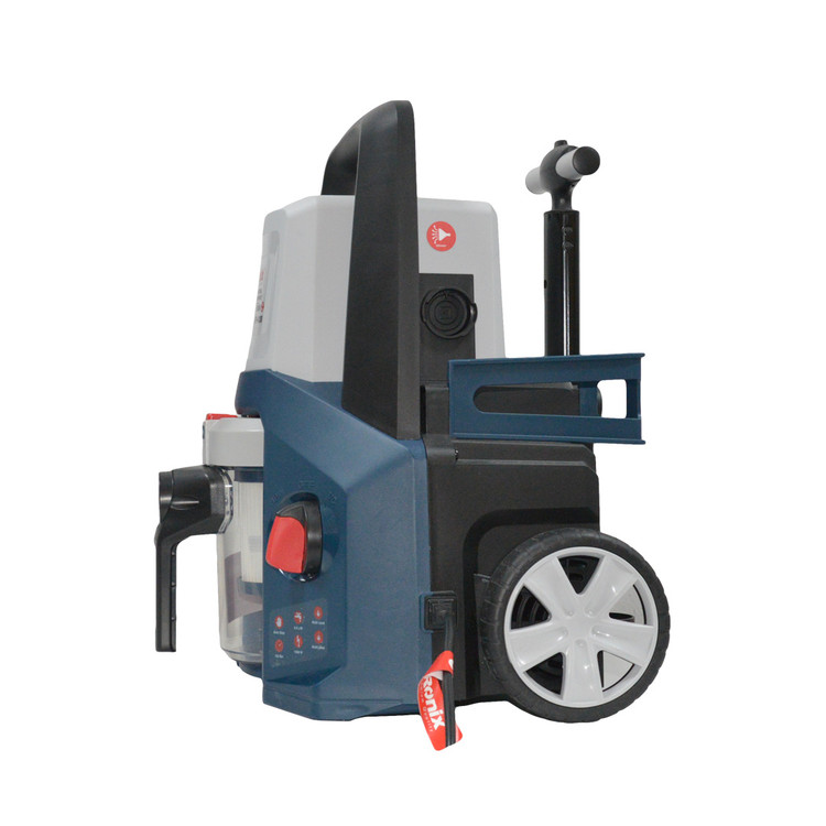 کارواش چهار کاره رونیکس مدل RP-4100 سری جدید ، مجهز به موتوری قدرتمند با توان 1500 وات است که باعث افزایش فشار و قدرت در تمیزکاری می شود. این دستگاه دارای سیستم سوئیچ اتو استاپ است که در صورت رها کردن ماشه توسط کاربر کارواش به صورت خودکار موتور را خاموش می کند، که این ویژگی باعث افزایش طول عمر موتور شده و نیز از اتلاف انرژی جلوگیری میکند. این کارواش مجهز به سیستم حفاظت گرمایی است که هنگام افزایش دمای آن موتور را به صورت خودکار خاموش کرده و از استهلاک قطعات داخلی دستگاه جلوگیری می کند و همچنین عمر دستگاه را افزایش می دهد. تفنگ آب پاش پیشرفته این کارواش در موارد مختلفی کاربرد داشته و کار با آن بسیار آسان و راحت می باشد. این دستگاه دارای کوپلینگ اتصال سریع جهت اتصال و جدا کردن سریع شلنگ نیز میباشد. این کارواش مجهز به نازل های قابل تنظیم و توربو است که از مواد اولیه باکیفیت ساخته شده و باعث تسلط بیشتر کاربر و تنظیم و کنترل زاویه پاشش می شود. این کارواش دارای مخزن مواد شوینده خارجی جهت افزایش قدرت تمیزکاری و نیز کاهش زمان فرآیند نظافت و شستشو است. این محصول به منظور حمل و نقل آسان تر و اشغال فضای کمتر دارای چرخ و دسته تلسکوپی ارگونومیک است. این کارواش چهار کاره جهت جذب ذرات معلق در هوا دارای فیلتر HEPA است که کارایی این دستگاه را به حداکثر میزان ممکن می رساند. کارواش چهار کاره رونیکس مدل RP-4100 دستگاهی چهار کاره با قابلیت استفاده به عنوان کارواش و جارو برقی خشک و تر و نیز دمنده است. کارواش آب را به وسیله نازل آب با فشار بالایی به روی سطوح مورد نیاز هدایت می کند و فشار بالای آب سطح مورد نظر را تمیز می کند. به همین دلیل کارواش از وسایل کاربردی در صنایع مختلف به شمار می آید. کارواش ها انواع مختلفی داشته و با توجه به نوع کابرد انتخاب می شوند. از مزیت های کارواش به صرفه جویی در مصرف آب و زمان و نیرو می توان اشاره کرد. با استفاده از کارواش می توان آلودگی را از روی سطوح مختلف مانند: ماشین، سالن های بزرگ و پارکینگ و... با سرعت و فشار بسیار بالایی از بین برد.