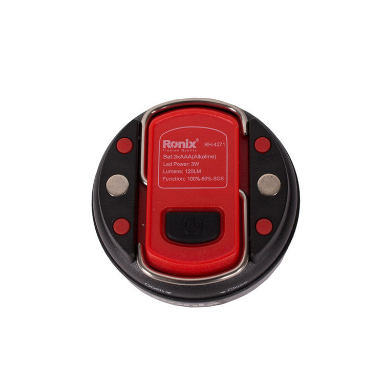 چراغ گرد آهن ربایی RH-4271 رونیکس، ابزاری برای روشنایی سطوح پایین است که در مکان های تاریک یا فضاهایی که نور کافی ندارند، نوری به اندازه 120 لومن روشنایی با 15 متر برد با 100 درصد توان و 11 متر با 50 درصد توان روشنایی به شما می دهد. مدت کارکرد این محصول 5 الی 6 ساعت بصورت متوالی می باشد. نور این وسیله را به راحتی می توانید تنظیم کنید و یا در حالت چشمک زن قرار دهید. برای قرار دادن چراغ قوه گرد آهن ربایی رونیکس روی سطوح فلزی، از مگنت و برای آویز کردن، از یک قلاب استفاده شده است که موجب کارایی بهتر آن می شود. بدنه این محصول در برابر ضربات احتمالی، مقاومت بالایی دارد.