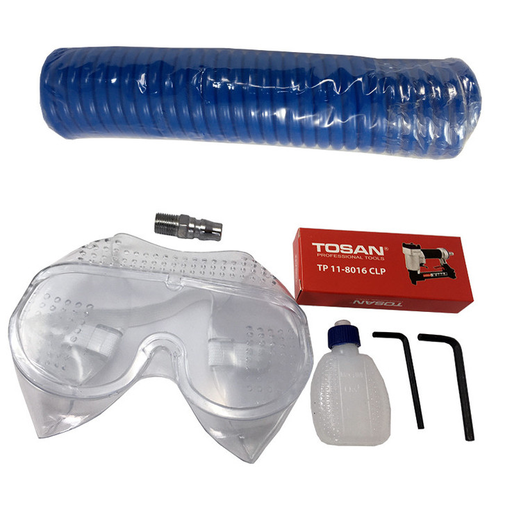 شیلنگ 600 عدد میخ منگنه 2 عدد آلن با سایز های 3 و 4 ظرف روغن کوچک عینک 1 عدد کوپلینگ