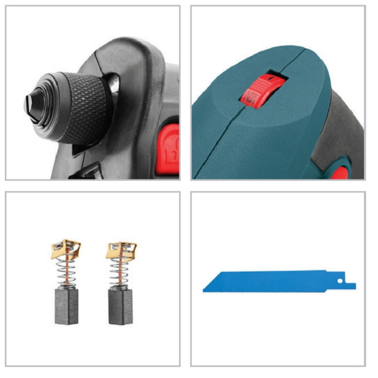مجهز به ابزار گیر فلزی. مجهز به سیستم تعویض تیغ اره بدون نیاز به استفاده از ابزار. دارای قابلیت تنظیم عمق برش برای فعالیت های متفاوت. دارای دیمر تنظیم سرعت. دارای طراحی منحصر به فرد و وزنی سبک جهت حمل آسان میباشد.