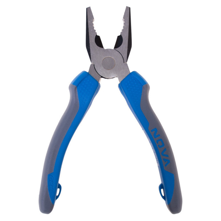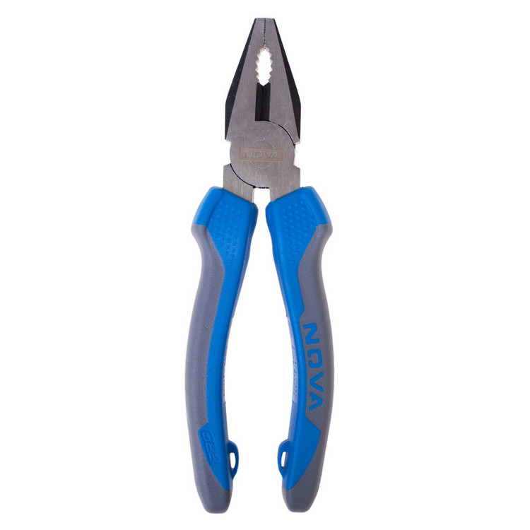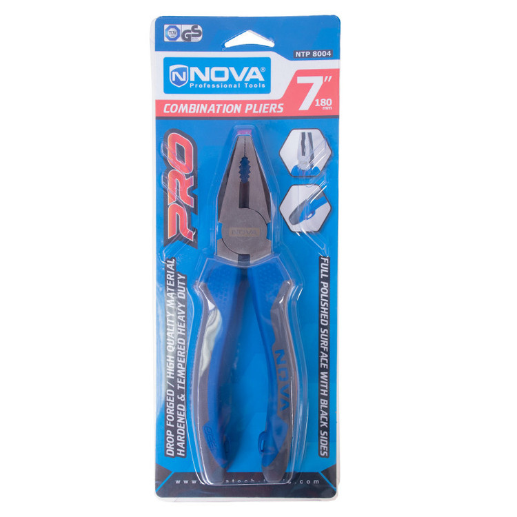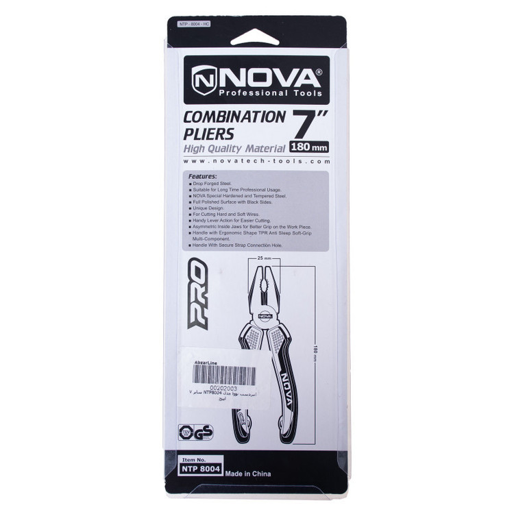انبردست نووا مدل NTP 8004، دارای بدنه ای از جنس فولاد دراپ فورج شده است که به روش ویژه نووا سخت کاری شده است و مقاومت آن را در برابر فشار، فرسودگی و زنگ زدگی در اثر تماس با رطوبت و استفادهی طولانی مدت بالاتر برده است.انبردست نووا برای خم کردن قطعاتی که به نیروی بیشتر دست انسان نیاز دارند استفاده میشود. بنابراین این ابزار دستی برای نگه داشتن، خم کردن قطعات گوناگون و همچنین بریدن سیم های نرم و ضخیم مختلف، کاربرد فراوانی دارد.اندستههای این انبردست، از روکش پلاستیکی نرم TPR با طراحی ارگونومیک ساخته شده است که در هنگام کار طولانی مدت، راحتی و عدم تعریق دست را برای کاربر به همراه دارد. این دسته ها طولی برابر با 120 میلیمتر دارند.از نوک انبردست می توانید برای گرفتن قطعات مختلف و از قسمت میانی آن برای قطع کردن و بریدن انواع سیم استفاده کنید. فک های انبردست نووا 7 اینچ طولی برابر با 40 میلی متر دارند که میزان 10 میلیمتر از آن آجدار شده است و به صورت کاملا متقارن برای محکم گرفتن قطعات در هنگام کار، طراحی و ساخته شده اند. سطح دهانهی این انبردست نووا کاملا صیقلی و کنارههای آن سیاه اندود شده است.
