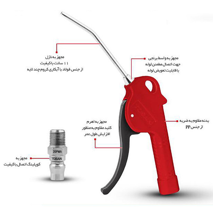 سایر توضیحات: نام : بادپاش / برند : توسن / فشار کاری : 90-120 PSI / قطر نازل : 2 میلیمتر / طول لوله نازل : 110 میلیمتر / سایز کوپلینگ : 1/4 اینچ / نوع کوپلینگ : 20PMA