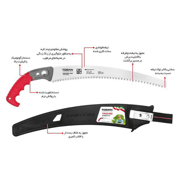 اره باغبانی توسن یک ابزار باغبانی می باشد که در باغبانی صنعتی و سنتی و کشاورزی مورد استفاده قرار میگیرد. با توسعه و پیشرفت تمامی صنایع از جمله صنعت کشاورزی و باغبانی استفاده از ابزار آلاتی که باعث بالا بردن سرعت و کیفیت کار شوند ضروری می باشد. یکی از بهترین ابزار باغبانی انواع اره دستی در سایز و ابعاد و قیمتهای مختلف می باشد.اره باغبانی توسن در بریدن و حرص کردن انواع شاخه و ساقه و انواع چوب و … به آسانی با سرعت بالا می توان استفاده کرد. لازم به ذکر است از مهمترین موارد یک اره تعداد داندانه ها در واحد طول است که در هر سانتیمتر چند دندانه وجود دارد. از دندانه های بزرگتر برای اجسام نرمتر و از دندانه های ریز برای اجسام سخت تر استفاده میشود .استفاده از اره با دندانه های درشت سرعت بریدن را بالا برده ولی دقت و تمیزی کار پایین می آید. ولی در اره با دندانه های ریز سرعت بریدن کند، ولی دقت و تمیزی سطح برش بالا می رود. اره های دستی در دو نوع یکطرف برش و دو طرف برش می باشد که در جهت برگشت نیز عمل بریدن را به خوبی انجام می دهد.تمامی اره های دستی تیغه آنها جهت دار است و با خط عمود بر اره زاویه میسازند. هرچه این زاویه بیشتر باشد عرض بیشتری از اجسام براحتی بریده میشود. به هنگام استفاده از اره باغبانی توسن رعایت نکات ایمنی از جمله دستکش کار و لباس کار مناسب و عینک ایمنی بسیار مهم و ضروری می باشد.اره باغبانی توسن یا اره دستی 330 میلیمتری شرکت توسن، تهیه شده از فولاد سخت کاری شده و دسته ضد لغزش از پلاستیک فشرده PVC می باشد. تیغه ضد زنگ دو طرفه با سختی 5 HRC. دارای غلاف از جنس پلی پرو پیلن است.