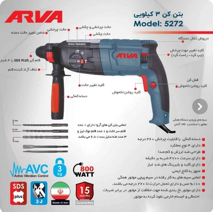بتن کن مدل ۵۲۷۲ آروا ۳ کیلو با گارانتی شرکتی و کیف ۸۰۰وات ۳کاره