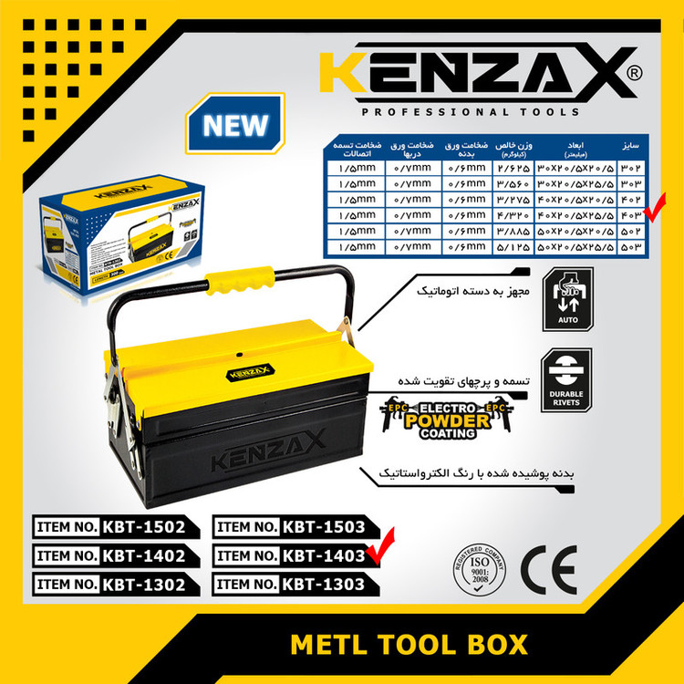 از مهمترین وسایل مورد نیاز در هر منزل و محل کاری، داشتن یک جعبه ابزار مناسب جهت نگهداری، جابه جایی و دسترسی بهتر به ابزار است. جعبه ابزار فلزی «کنزاکس» علیرغم اینکه نمونه مشابه محصولات خارجی ست که در داخل کشور توسط متخصصین شرکت کنزاکس طراحی گشته و در کارخانه ای معتبر به سفارش کنزاکس ساخته میشود. یکی از ویژگیهای این جعبه ابزار استحکام و زیبایی و برخورداری از وزن خالص کم برابر در حدود 4.4 کیلوگرم است. آنچه جعبه ابزار فلزی کنزاکس را از سایر جعبه ابزار های موجود در بازار متفاوت میکند مکانیسم اتوماتیک باز و بسته شدن طبقات توسط دسته و لولاهای مرتبط است . توضیح مکانیسم اتوماتیک : کاربر میتواند با فشار اندکی بر دسته در زوایه قایم بسمت پایین طبقات جعبه را باز و با کشیدن دسته در جهت بالا طبقات را مجددا به حالت بسته(اولیه) برگرداند . از دیگر ویژگیهای جعبه ابزار فلزی کنزاکس مدل KBT-1403 میتوان به تسمه و پرچهای تقویت شده و روان بودن مکانیسم اتوماتیک اشاره نمود ضخامت ورق آهن استفاده شده در ساخت جعبه ابزارهای فلزی کنزاکس برای درب ورق 0.7mm ، بدنه 0.6mm و تسمه 1.5 mm میباشد. دستگیره حمل از جنس ABS میباشد . از دیگر محاسن این کالا میتوان به پوشش بدنه با رنگ الکترواستایک و تعداد طبقات آن اشاره کرد ، برای این محصول سه طبقه در نظر گرفته شده است. سینی مجزا با پنج محفظه جداگانه درون این جعبه ابزار به خصوصیات و کاربردهای آن میافزاید. این سینی به گونهای طراحی شده که علاوه بر برخوردار بودن از یک دسته محکم، پنج جایگاه با ابعاد مختلف را برای شما در نظر گرفته تا هر گونه ابزار با سایزهای متفاوت را در آن دسته بندی کنید.