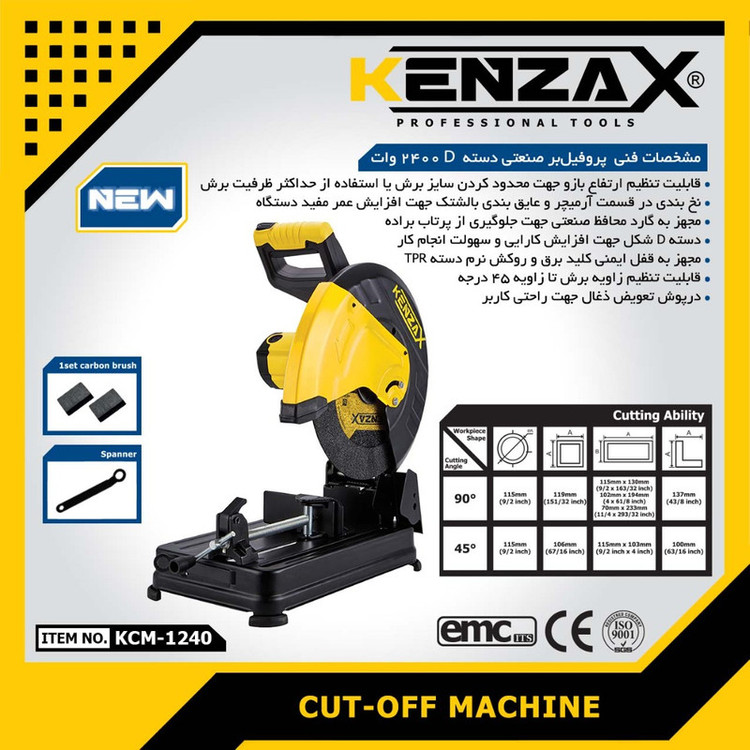 محصول فوق یکی دیگر ازمحصولات برقی تولیدی شرکت "کنزاکس" (KENZAX)میباشد. ارههای پروفیل بر مدل KCM-1240 از سری محصولات برقی کنزاکس است که مورد توجه بسیاری از صنعتگران قرار گرفته است. این دستگاه برای برش پروفیلهای فلزات در اشکال مختلف مورد استفاده قرار میگیرد. این دستگاه از دیسکی چرخان برای این کار استفاده میکند. این پروفیل بر توانی برابر 2400 وات دارد و دیسک آن با سرعتی معادل 3900 دور در دقیقه میچرخد. این دستگاه قابلیت تنظیم ارتفاع بازو جهت محدود کردن سایز برش یا استفاده از حداکثر ظرفیت برش را دارا میباشد. نخ بندی در قسمت آرمیچر و عایق بندی بالشتک جهت افزایش عمر مفید دستگاه در نظر گرفته شده است ارههای پروفیل بر مدل KCM-1240 مجهز به گارد محافظ صنعتی جهت جلوگیری از پرتاب براده ،دسته D شکل جهت افزایش کارایی و سهولت انجام کارو مجهز به قفل ایمنی کلید برق و روکش نرم دسته TPR است ارههای پروفیل بر مدل KCM-1240 قابلیت تنظیم زاویه برش تا زاویه 45 درجه را داراست. برای این دستگاه درپوش تعویض ذغال جهت راحتی کاربر در نظر گرفته شده است