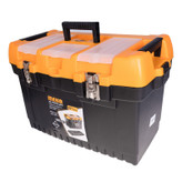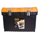 جعبه ابزار پلاستیکی مهر 22 اینچ، از سری جعبه ابزارهای باکیفیت و بادوام موجود در بازار است که با قیمت هایی مقرون به صرفه عرضه میشوند.جعبه ابزار مهر مدل JMT-22 با حجم داخلی حدود 36 لیتر و دارا بودن انواع محفظه های درپوش دار و ساده و داشتن چند دسته و قفل، جزو جعبه ابزارهای بزرگ، جادار و کاراییست که کاربر را از حمل جعبه ابزارهای متعدد بی نیاز میکند.این جعبه ابزار 22 اینچ مهر پلاستیک، دارای 3 عدد نظم دهندهی مجزای پلاستیکی درپوش دار شفاف تعبیه شده بر روی در جعبه است که برای نظم دادن به انواع پیچ و مهره و رولپلاک، مته و قطعه های کوچک گوناگون با سایزهای متفاوت مناسب است.در داخل این جعبه ابزار مهر و در قسمت زیر درب اصلی، یک سینی متحرک پلاستیکی 6 محفظهای برای نظم دادن به انواع ابزارهایی مانند آچار و انبر قرار داده شده است که برای جا به جایی آسانتر این سینی بزرگ، یک دسته پلاستیکی بسیار مقاوم به آن متصل شده است. این سینی به راحتی قابلیت جدا شدن و حمل به صورت جداگانه را دارد.برخلاف بعضی از جعبه ابزارهای موجود در بازار، این جعبه دارای دو عدد قفل به صورت فلزی و بسیار با کیفیت است که برای ایمنی بالا و جلوگیری از ریختن ابزار در داخل جعبه، در هنگام سنگینی، دو عدد قفل پلاستیکی هم، در دو سمت جانبی جعبه تعبیه شده است.