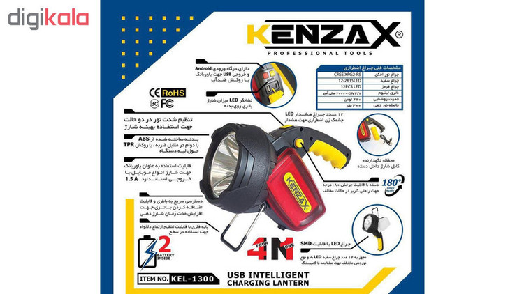 نورافکن دستی «کنزاکس» مدل KEL-1300 دستگاهی 4 منظوره میباشد ، که شامل سه منبع نور مختلف است تا بتوان بنا به شرایط از یکی از آنها استفاده کرد. چراغ اصلی این نورافکن نور مناسبی دارد و نهایت برد آن برابر با 300 متر است که باعث میشود این محصول برای زمان سفر به مناطق گوناگون کاربردی باشد. همچنین این چراغ دارای دو حالت نوردهی پرنور و کمنور است و بنا به موقعیت میتوان یکی از آنها را انتخاب کرد. دو منبع نوردهی دیگر این محصول نیز به شکل صفحههایی قرمز (با 12 عدد چراغ LED) و پنلی با نور سفید و در طرفین قرار گرفتهاند. صفحهی قرمز حالتی چشمکزن جهت هشدار دارد و میتواند بهعنوان چراغخطر مورداستفاده قرار بگیرد. صفحهی سفید نیز دو حالت کمنور و پرنور دارد و نور ملایمی ایجاد میکند که میتواند برای بهتردیدن اجسام نزدیک مناسب باشد. این موضوع آن را برای استفاده در انواع ماجراجوییها مناسب میسازد. نسل جدید KEL-1300 دارای دو باطری لیتیوم 3.7 ولت 2000 میلی آمپرمیباشد که مجموع توان 4000 میلی آمپر در اختیار کاربر قرار میگیرد و با توجه به خروجی نصب شده USB روی بدنه این دستگاه از KEL-1300 میتوان بعنوان پاور بانک در مواقع ضروری استفاده نمود . این کالا هم توسط برق شهر شارژ میگردد (با استفاده از مبدل برق به USB) که این روزها برای شارژ اکثر گوشی های هوشمند در دسترس است و هم میتوان جهت شارژ آنرا به درگاه یو اس بی رایانه نیز متصل نمود . همچنین این دستگاه دارای نمایشگری است که توان باقیمانده باتری را با 4 چراغ آبی رنگ نمایش میدهد .