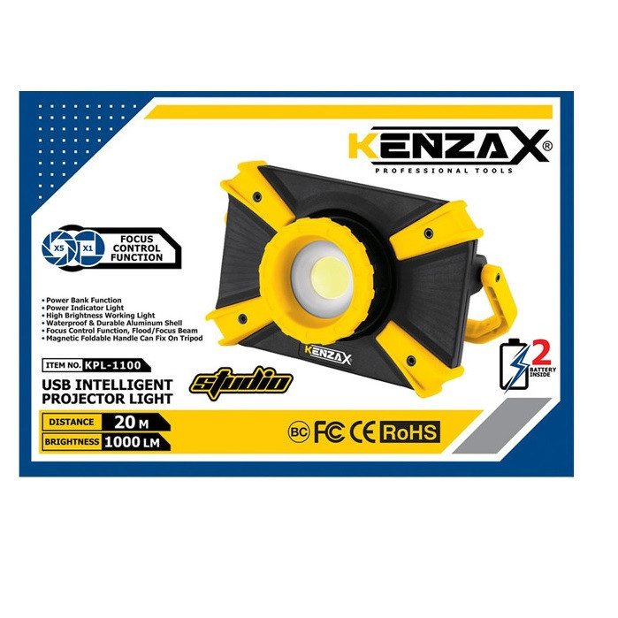 پروژکتور شارژی کنزاکس مدل 1100 دارای برد 20 متر می باشد.این دستگاه از دو عدد باطری داخلی 3.7 ولت بهره مند است.از مزایای این دستگاه می توان به پورت شارژ USB که روی خود دستگاه تعبیه شده است اشاره کرد. در پشت دستگاه با فشردن یک بار دکمه خاموش روشن نمایشگر شارژ باطری روشن می شود که می توان میزان شارژ دستگاه رو چک کرد. از این دستگاه می توان به عنوان پاور بانک در مواقع ضروری استفاده کرد.در جلوی دستگاه لنزی قرار داده شده که می توان میزان باز یا بسته بودن نور را تنظیم کرد. با استفاده از کلید خاموش روشن دستگاه(نگه داشتن دکمه در حالت روشن) مب توان شدت نور را تنتظیم کرد.دستگاه دارای پایه جهت تکیه دادن یا بستن روی سه پایه قابل استفاده است