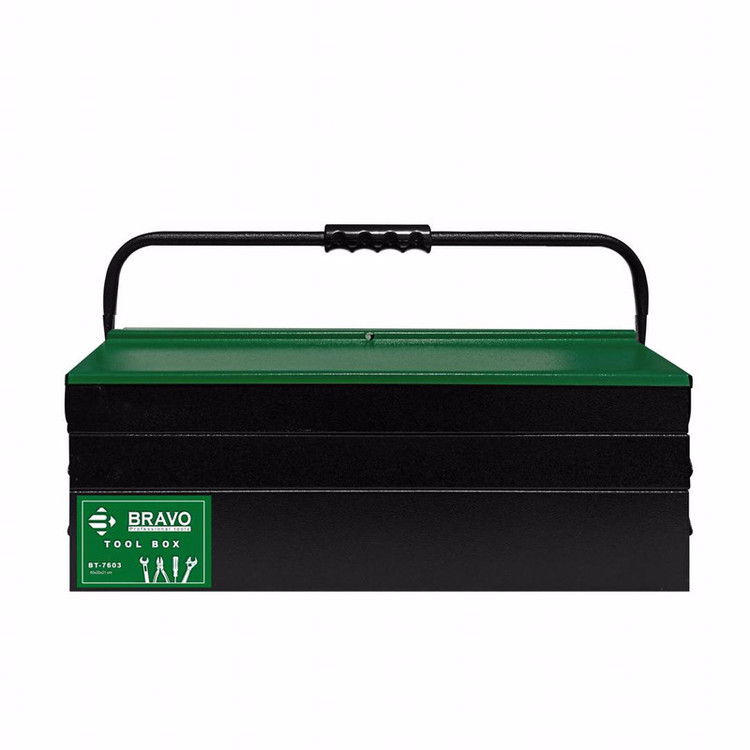 این محصول جعبه ابزار فلزی 60 سانتیمتر 3 طبقه براوو می باشد. این محصول از ورق فولادی ضخیم و مقاوم و همچنین ضد زنگ ساخته شده است. برای مقاومت بالای محصول در برابر خط و خش و همچنین زیبایی جعبه ابزار از رنگ چرمی الکترو استاتیک کوره ای بعنوان روکش ورق فولادی بدنه استفاده شده است. همچنین در اتصالات طبقات جعبه و درب و دسته جعبه ابزار پرچ های فولادی به کار برده شده است تا مقاومت بالایی برایی جابجایی جعبه و باز و بست نمودن آن داشته باشد. طراحی جعبه ابزار فلزی براوو کاملا مهندسی شده و دارای کارایی بالا نسبت به فضای آن می باشد. در قسمت وسط دسته از یک دستگیره پلاستیکی از جنس ABS با طراحی ارگونومیک جهت حمل آسان استفاده شده است.