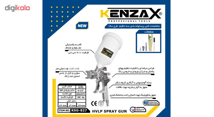 پیستولههای برقی یا بادی ازجملهی وسایلی هستند که از آنها برای نقاشی و رنگآمیزی سطوح مختلف استفاده میشود. استفاده از این ابزار سرعت عمل نقاش را بالا میبرد. البته در خصوص ییستولههای بادی باید در نظر داشت که به یک منبع یا کمپرسور باد احتیاج دارند. یکی از پیستولههای رنگ که توسط شرکت کنزاکس (KENZAX) تولید میشود، مدل KSG-827است. این محصول دارای تنوع در قطر نازل (5/7،1/1 و 1.8) میلیمتر بسته به کاربری میباشد . از جمله مزایای KSG-827 میتوان به کاسه (مخزن) رنگ پلاستیکی شفاف و مقاوم با ظرفیت 600 میلی لیتر اشاره نمود . همچنین بدنه ی آلومینیومی این محصول دارای روکشی از آلیاژ کروم نیکل میباشد که هنگام شستشو در تینر باعث عدم خوردگی آن میگردد. سوزن این محصول از جنس استیل ضد زنگ ، نازل از جنس برنج ساخته شده است. در ساخت این پیستوله کنراکس KSG-827 از تکنولوژی HVLP بهره برداری شده است که با کمترین میزان فشار بیشترین پاشش رنگ را امکان پذیر می نماید . سوزن استیل ضد زنگ که ستفاده شده که باعث عمر بیشتر این پیستوله میشود . همچنین مخزن این مدل 600 میلیلیتر رنگ را در خود جای میدهد. برای استفاده از این محصول باید یک پمپ یا کمپرسور باد داشته باشید. سپس پیستولهی رنگ را با شلنگهای مخصوص به کمپرسور متصل کنید. از مزایای KSG-827 کنزاکس میتوان به دنباله شلنگ خور آن اشاره نمود . مخزن این محصول را با رنگ پر کرده و رنگآمیزی را شروع کنید. به همراه این محصول، چند قطعه لوازم جانبی شامل آچار، فرچهی کوچک و فیلتر قرار دارد که به کمک آنها، میتوانید استفادهی بهتری از پیستوله کرده و آن را به راحتی تمیز کنید. از آچار برای باز کردن قطعات و از فرچهی کوچک برای تمیز کردن قطعات بازشده استفاده میشود. فیلتر کوچک هم برای قرار گرفتن در محل اتصال مخزن به پیستوله در نظر گرفتهشده و از ورود اجسام ریز به داخل پیستوله جلوگیری میکند. شما میتوانید برای سرعت دادن به روند رنگآمیزی، بهجای استفاده از قلمموی رنگ از پیستولهی بادی مانند پسیستوله بادی کنزاکس مدل KSG-827استفاده کنید. جنس فلزی بدنه و نازل استیل در این محصول، باعث مقاومت و عمر بسیار بالای آن میشود. مخزن پلاستیکی این محصول حجم مناسبی از رنگ (600 سیسی) را در خود جای میدهد. پس از هر بار استفاده از پیستوله، باید به کمک وسایلی که به همراه این محصول ارائهشده، قطعات آن را از هم بازکرده و تمیز کنید.
